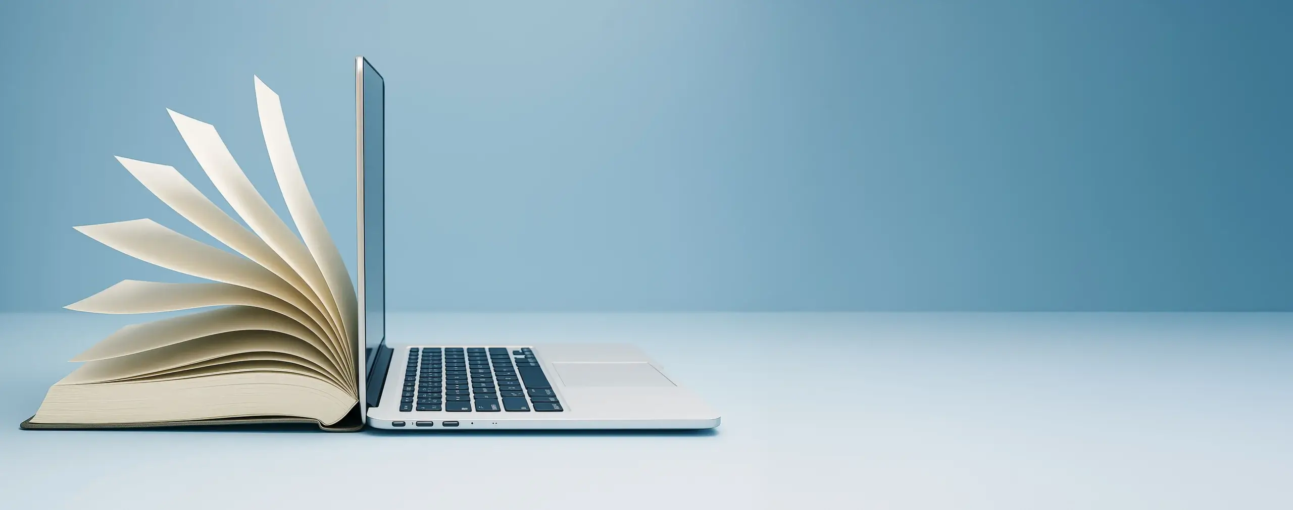 Open book and laptop placed back-to-back on a clean light blue background, symbolizing modern education and online learning concept.